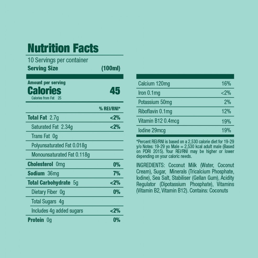 Coconut Milk (Water, Coconut Cream), Sugar, Minerals (Tricalcium Phosphate, lodine), Sea Salt, Stabiliser (Gellan Gum), Acidity Regulator (Dipotassium Phosphate), Vitamins (Vitamin B2, Vitamin B12). Contains: Coconuts